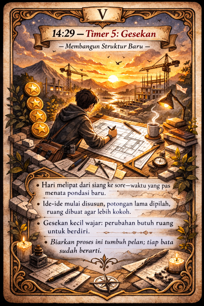 Siang yang mulai condong ke sore sering jadi waktu ketika sesuatu terasa “bergeser”. Ide yang tadinya masih kabur mulai mencari bentuk, tapi belum semuanya pas di tempatnya. Gesekan kecil biasanya muncul di fase ini—bukan tanda salah arah, lebih seperti bagian dari proses menyusun ulang potongan lama agar struktur baru bisa berdiri. Kadang pikiran terasa sibuk menimbang, membongkar, lalu merangkai kembali.
