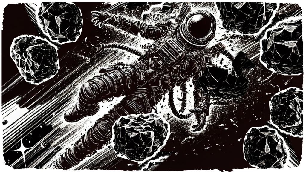 Napasnya sendiri terdengar asing, di-filter life-support seperti hantu bernapas di balik baju zirah baja. Ruang hampa menyambut dengan dingin psikologis—bukan fisik—dingin kesadaran bahwa ia meluncur menuju sesuatu yang tak bisa ia pahami; mungkin juga sebuah akhir dari segalanya.